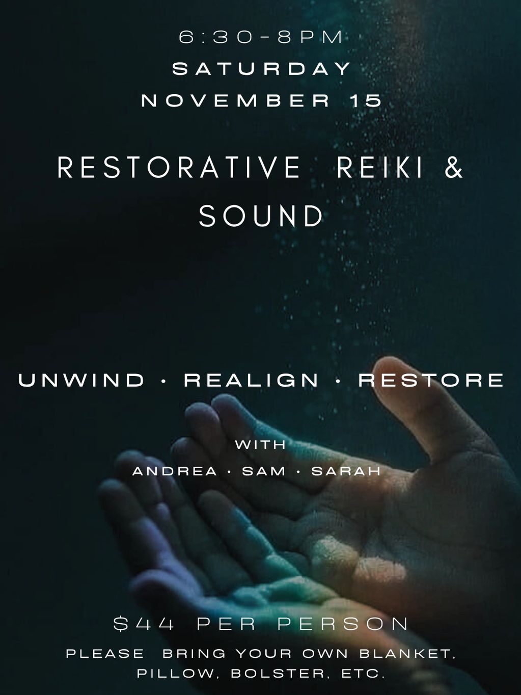 Please bring your own blanket, pillow, bolster, eye cover, etc. for your comfort (props are limited)